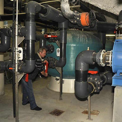 L’eau est tout d’abord stockée, puis décantée dans deux bassins de 200 m3. Elle est ensuite filtrée : l’aquarium du Croisic utilise pour cela 2 techniques :